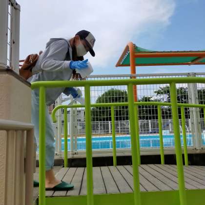 プール授業後の消毒作業