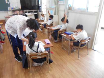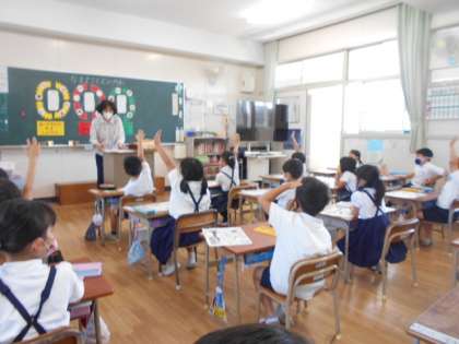 「食品の名前」と「食品の絵」を線で結ぶことで、様々な食品の名前を覚えました。食品を赤・黄・緑の3つのグループに分けてその働きについても学習しました。そして給食はたくさんの食品が使われていて、望ましい食事になっていることが分かりました。