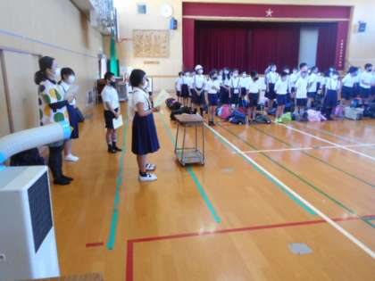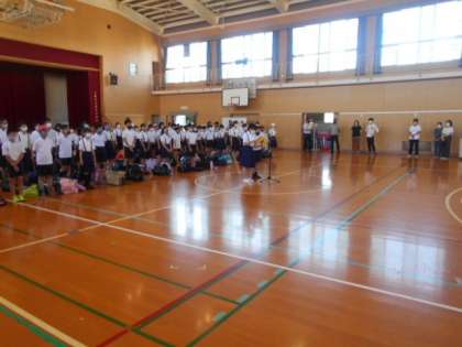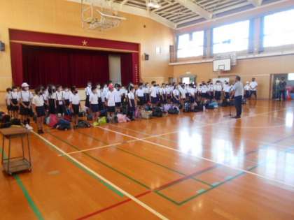 5年生は21〜22日にハチ北高原へ林間学習に行きます。出発式では校長先生の話やいろいろな連絡の後、代表の児童が元気よくあいさつをしていました。