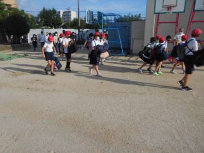 無事にバスが到着しました。これから体育館で帰校式です。