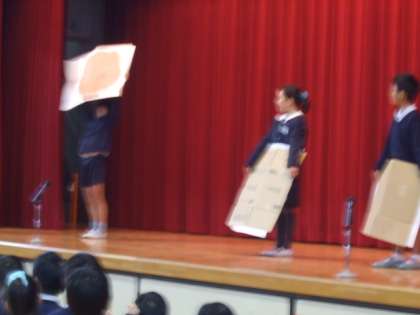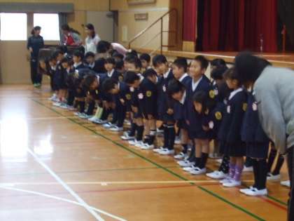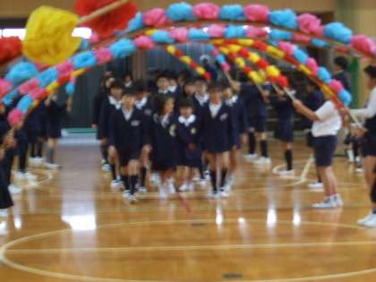 10日(金)に「1年生を迎える会」を行いました。6年生のお兄さんやお姉さんと手をつないでアーチをくぐりながら入場しました。最初は、少し緊張した顔つきでしたが、少しずつ笑顔が見え始めました。ジャンケン大会のあと、1年生全員で「よろしくお願いします。」と大きな声であいさつをしました。あったかい雰囲気の会になりました。