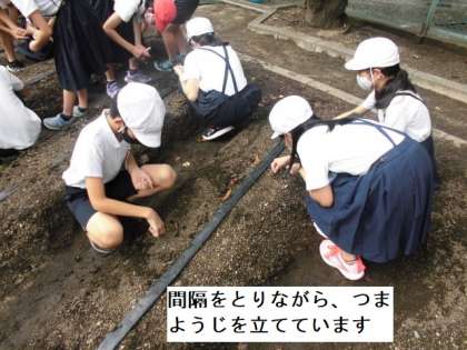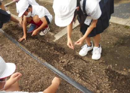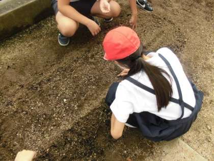 田辺大根サポーターの方に教えていただいた6年のリーダーが、5年生にていねいに教えていました。みんな種と種との間隔を、自分の指を広げてはかって目印の爪楊枝をたてました。そして、その目印を中心に5粒ずつ種を植えていきます。