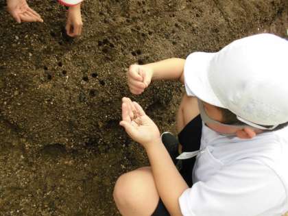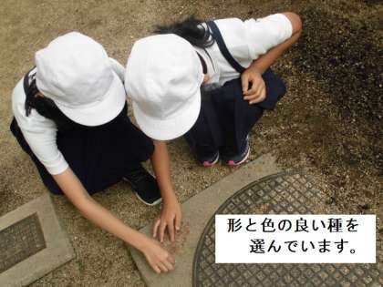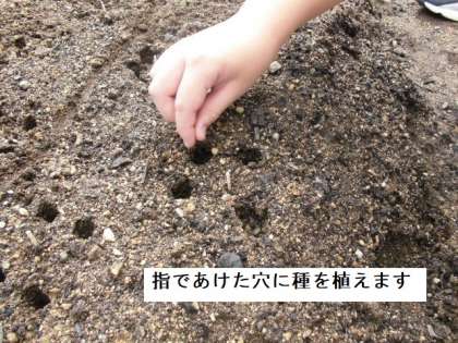 場所が決まるといよいよ種を植える穴を指であけていきます。そこに一粒ずつ種を入れていきます。できるだけ形や色の良いものを選んで植えるようにします。