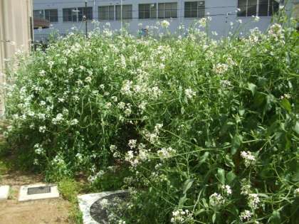 新校舎の南側に新しい田辺大根の畑ができているのをご存知ですか?道にはみ出しそうなくらいに大きくなって花を咲かせています。モンシロチョウがたくさん飛んできています。なかには早くも実になっているものもあります。今年も、大きな田辺大根に育つ種になってくれることと思います。