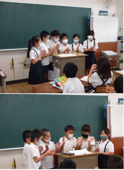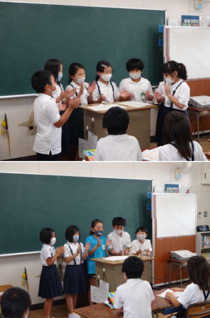 音楽の学習でリズムアンサンブルをしました。班ごとに「おまつり」という言葉を3種類のリズムで表現しました。どの班も一生懸命練習をして、みんなの前で発表していました。