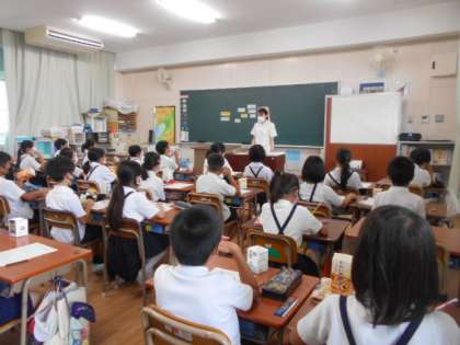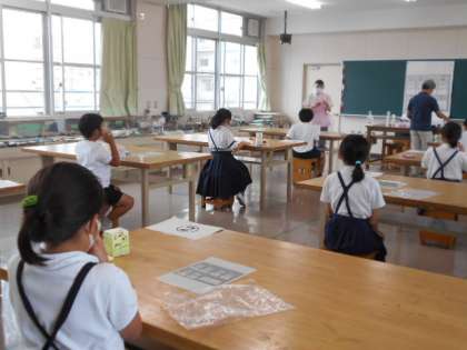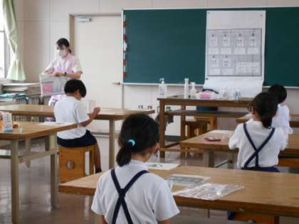 学校歯科医の先生と歯科衛生士の先生に来ていただいて、フッ化物洗口をしていただきました。