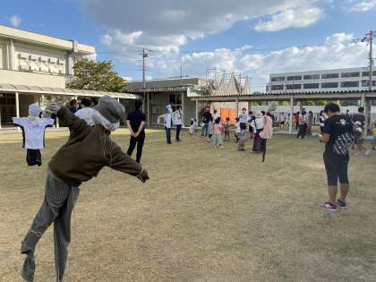 長池小学校の芝生を一年中楽しむため、冬芝の種まきが行われました。まいた種を食べてしまう鳥を追い払うため、案山子(かかし)を作り、芝生広場に設置しました。
