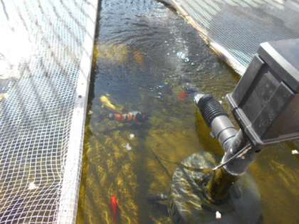 例えば池の水が濁らないようにフィルターを清掃したり、植物の剪定をしたりしています。フィルターを定期的に清掃することで水が透き通り、おかげで池の鯉がきれいに見えるようになっています。