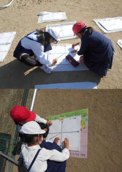 3年生は理科の学習で、「影と太陽」の学習をしています。今日は晴れる予報だったので、影の向きと長さを記録する学習をしました。休憩時間ごとに交代で観察しました。午後になって記録用紙にどんどん書き込まれていくと、影と太陽の関係が分かりやすくなりました。