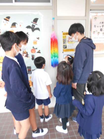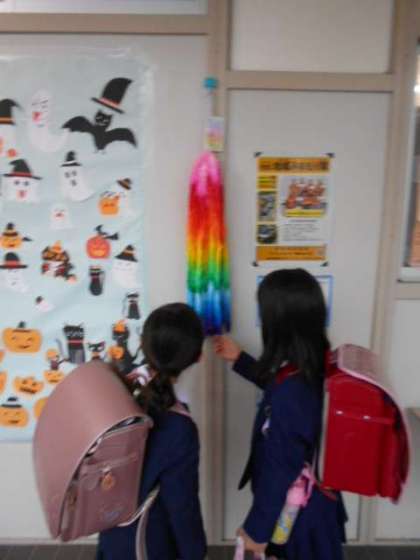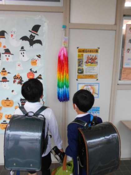 登校してきた人は、「わー、千羽鶴や!」「僕が作ったのはどれかな」などいろいろな感想が聞かれました。この千羽鶴を持って水曜日から修学旅行に行きます。