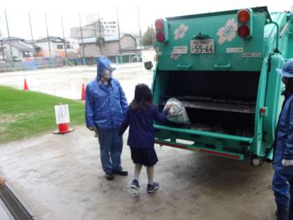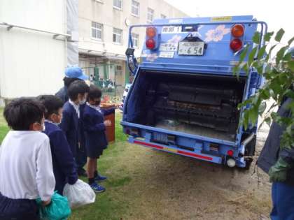 環境学習をしました。ごみの分別の仕方について学習し、その後パッカー車にごみ袋を入れる体験をしました。子どもたちは、パッカー車を近くで見ることができて、とても興味津々でした。