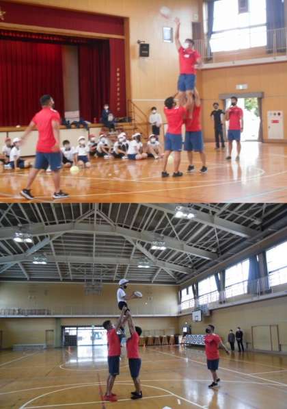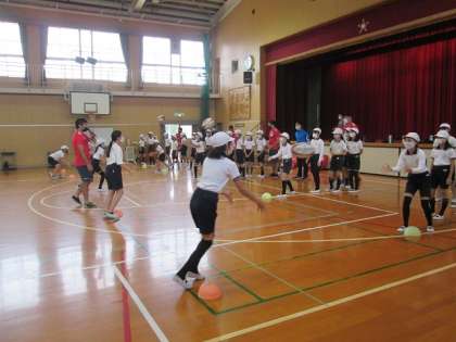 今回は「NTTドコモ レッドハリケーンズ大阪」の方々に来ていただきました。鬼ごっこやグループ作りなどのゲームでウォーミングアップを行い楽しく活動がスタートしました。ラグビーボールを実際に触り、パスの練習をしました。