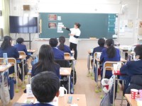 今日は、不審者が正門から侵入したという想定で行いました。まず、不審者に対して職員が不審者対応をします。同時に、以前から申し合わせている緊急放送を流すと、教室の児童はカギとカーテンをしめて待機します。