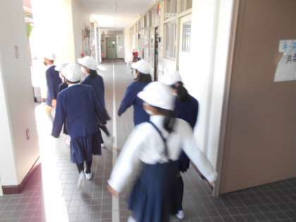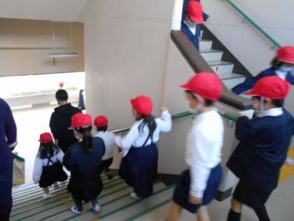 今日は、不審者が正門から侵入したという想定で行いました。まず、不審者に対して職員が不審者対応をします。同時に、以前から申し合わせている緊急放送を流すと、教室の児童はカギとカーテンをしめて待機します。