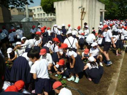 第2回目のふれあいタイムが5時間目にありました。教室で班と個人のネームプレートを書いてから農園の方へ来ました。6年生の人が、エダマメの苗の運び方や植え方をていねいに年下の子どもたちに教えていました。みんな話をよく聞いて上手に植えることができました。今年は、どれくらいエダマメの実ができるか楽しみです。