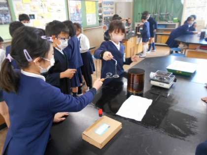 金ぞくの玉を熱したり、冷やしたりしたときのようすを調べました。実験用ガスコンロを使うのは初めてなので、最初は少し恐々としていましたが、だんだんと落ち着いて活動することができました。金属の玉が輪を通りぬけたり、止まってしまったりしたので、興味津々で授業に取り組んでいました。