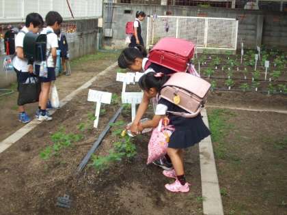 ふれあい農園のエダマメの世話は、月曜1・6年、火曜3年、水曜5年、木曜2年、金曜4年が当番でしています。もちろん毎日農園へ行って観察や世話をしている子どもたちもいます。今日は、初めての月曜日なので、朝から6年生が1年生に水やりの仕方を教えている場面が見られました。