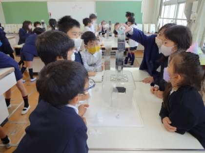 大阪市水道局の方に来ていただき、普段何気なく使っている水について学習しました。ろ過の機械をつくり、淀川の水がきれいになる様子を見て「すごい!」と驚いていました。