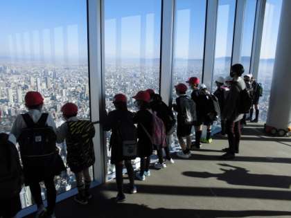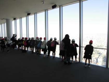 3日(金)3年生が社会科の学習で「あべのハルカス」に行きました。JRに乗っている時から「あべのハルカス」が見えて、到着する前から子どもたちはワクワクドキドキしていました。まず、エレベーターの速さに驚かされていました。あっという間に60階の展望台へつきました。