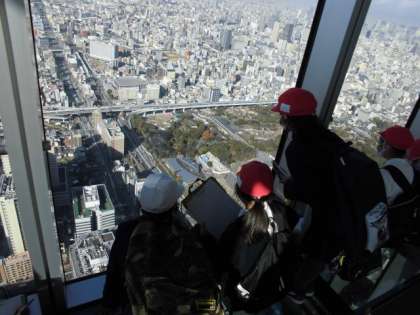 今日は晴天で遠くまでよく見渡せました。長居競技場は見つけやすかったので、その手前に見える長池小学校を発見できた子どもたちもいました。四天王寺や動物園・大阪城・通天閣などの建物もよく見えました。