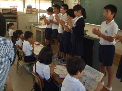 今日、保健委員会が1年生に手の洗い方を教えました。給食時間に流れる「あわあわ手あらいのうた」にあわせた、手の洗い方をしっかり覚えました♪