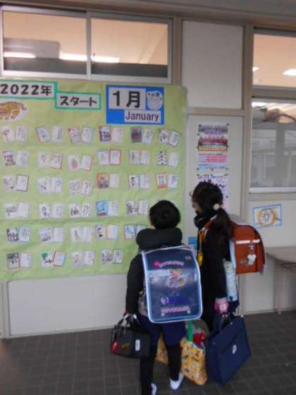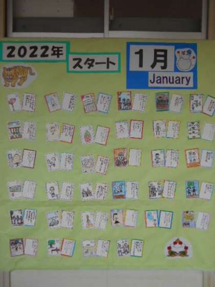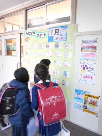 令和4年がはじまりました。毎月かわる職員室の前の掲示物がかわりました。2年生が作った楽しいカルタの掲示物です。登校してきた子どもたちは、新しい掲示物に気がついて見ていました。