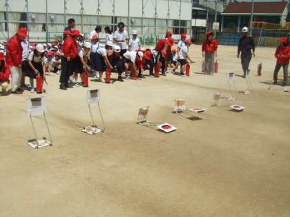 運動場に集合してから、地域のリーダーの方・区役所・消防署の方々のお話を聞きました。その後、低学年はけむりテントの中を通り、煙の危険性・避難の困難さを体験で学びました。また、高学年は、水消火器を使用して、消火器の操作やその効果を体験しました。