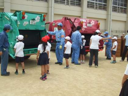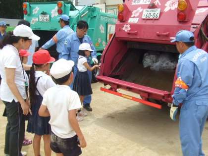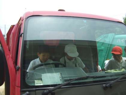 投入したゴミを今度は、一人一人がボタンを押して機械を動かしたり止めたりしました。最後に、運転席にも乗ることができ、普段では経験できないことを学習することができました。