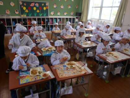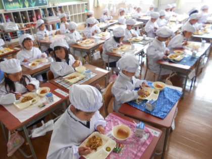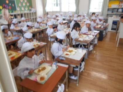 今日から給食が始まりました。1年生は初めての給食でした。おいしそうに食べていました。