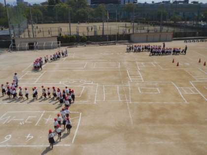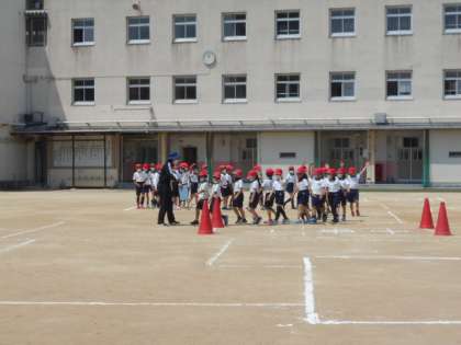 運動場にかいた道路や横断歩道を歩く練習や、駅のホームに並んだり、電車に乗ったりする練習をしました。