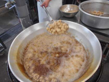 今日の給食は、まぐろのオーロラ煮、豚肉と野菜の煮もの、キャベツの赤じそあえ、ご飯、牛乳です。まぐろのオーロラ煮は、まぐろにでん粉をつけて揚げ、ケチャップ、砂糖、赤みそで作ったタレをからませています。元々はくじらのオーロラ煮の献立が、今はまぐろのオーロラ煮になりました。オーロラ煮の名前は南極で見られるオーロラの美しさから名付けられました。豚肉と野菜の煮ものは豚肉を主材に、しいたけでうま味を出し、玉ねぎ、にんじん、じゃがいも、つなこんにゃく、むきえだまめが入っています。キャベツの赤じそあえは、キャベツを焼き物機で蒸し、赤じその風味をきかせたタレであえています。