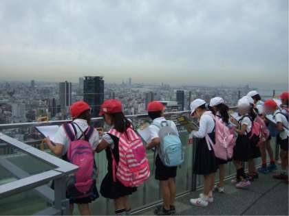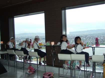 3年生は、6月5日に社会科の学習で「環状線一周と空中庭園」に社会見学にいきました。環状線一周では、窓から見える大阪の町と大阪駅の様子を観察しました。空中庭園では、そこから見える大阪の町を東西南北に分けて様子を調べることができました。昼ごろから少し雨が降り始めましたが、眺めの良い室内で昼食を食べることができました。
