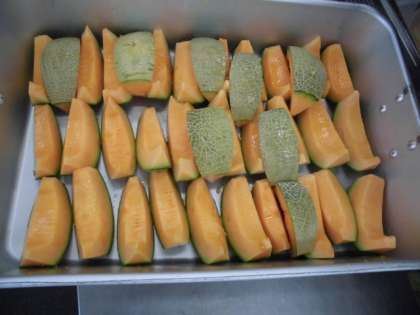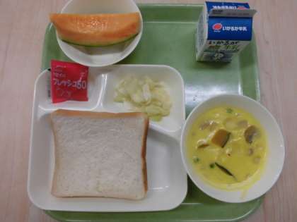 今日の給食は、かぼちゃのクリームシチュー、キャベツのゆずドレッシング、クインシーメロン、食パン、いちごジャム、牛乳です。かぼちゃのクリームシチューは、生のかぼちゃを丁寧に切り、ルウは、小麦粉を色づかないようにいためて作りました。かぼちゃの甘味があるおいしいシチューができました。キャベツのゆずドレッシングは、ゆずの香りがきいたさっぱりした味でした。クインシーメロンは、年1回出ます。中学校の分が34個、小学校の分が65個届き、給食室で、1個を1/8に切り、種を丁寧にとりました。