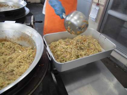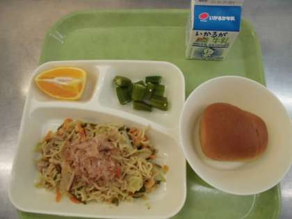 今日の給食は、和風焼きそば、オクラの甘酢あえ、オレンジ、黒糖パン、牛乳です。和風焼きそばは、豚肉や野菜、いかをいため、塩、こしょう、うす口しょうゆ、こい口しょうゆで味をつけたところに、ゆでためんを加えて、さらにいためて作りました。食べるときに、かつおぶしをかけていただきます。