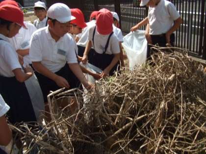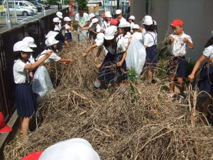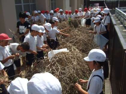 24日から3日間、6年生が自然体験学習に行っているので、その間最高学年の5年生が、2学期の「ふれあいタイム」で育てる田辺大根の種を収穫しました。この種は、何年も前から受け継いで学校で育ててきた田辺大根の子孫です。6年生が留守の間、この伝統を5年生がしっかりと感じて取り組む姿勢がとても頼もしかったです。きっと、今年も立派な田辺大根が育ってくれると思います。