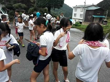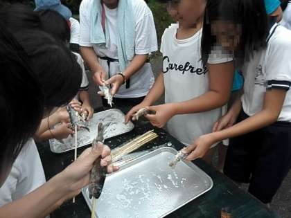 2日目午後の活動は、魚つかみです。川に入って自分の手で魚をつかみ、獲った魚を自分の手で洗い、塩もみをして、串刺しにして焼く。その串を持って、がぶっとほおばる。最高ですね!林間ならではのこの行事。魚の苦手な子もきっと「おいしい!」と食べたことでしょう。