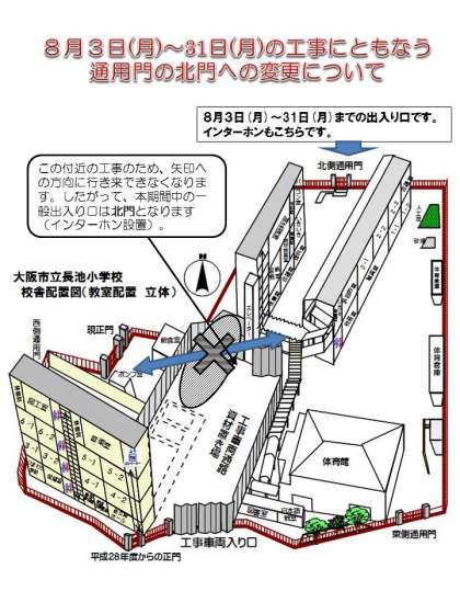 校舎建替工事に伴いまして、皆様方には大変ご迷惑をおかけしております。申し訳ございません。この8月中のみ工事の都合上、学校への一般出入口を北門に変更させていただいております。9月1日からは、1学期同様の仮正門に戻る予定となっています。ご不便をおかけしますが、何卒ご理解ご協力の程よろしくお願いいたします。