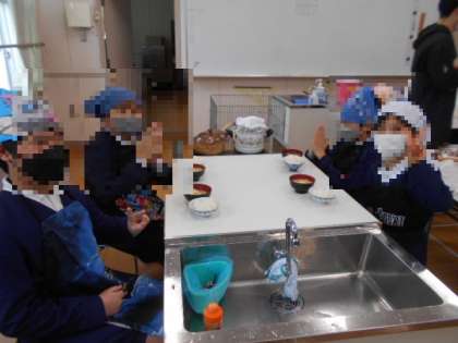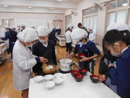 献立はご飯と、みそ汁です。ご飯はお鍋で炊きました。火加減が難しく焦げてしまった班もありますが、おこげも美味しくいただきました。