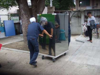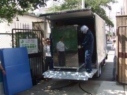 11時20分ごろ、食缶への配缶を終えると、コンテナへと積み込まれます。それを運送会社の方々が専用のトラックに積み込み、昭和中学校へ。中学生たちの喜ぶ姿が目に浮かびます。