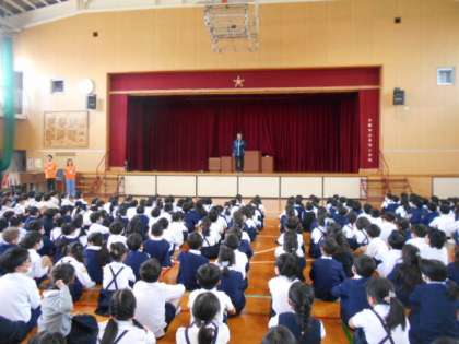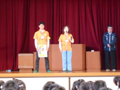 児童朝会に、「阿倍野区役所 地域見守り隊」の方が来てくださり、自己紹介と日々の防犯・交通安全に関する取り組みについての話をしてくだいました。日々みんなさんの安全のために、自転車や青色防犯パトロール車でパトロールをしてくださっています。