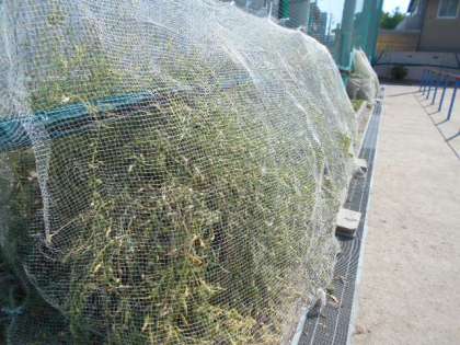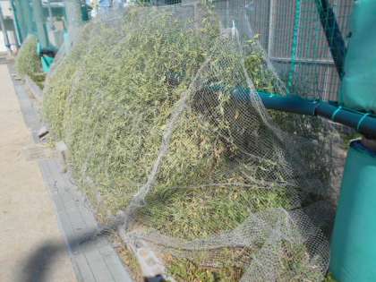 まだ緑色をしていますが、もう少しすると茶色になってきます。乾燥した種になると、鳥たちの絶好のエサとなってしまいます。そうなる前に田辺大根の上にネットをかけました。 この畑で採れた田辺大根の種を、全児童が2学期に植えることになります。収穫するまでこのネットが種を守ります。