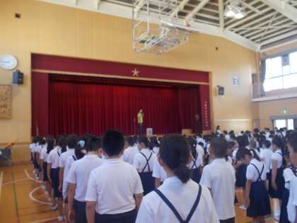 児童朝会の後、運動会にむけて諸注意や集団行動の練習をしました。気をつけ・休めの姿勢や「まわれ 右」「前へ すすめ」などの号令に合わせて集団行動の基本を練習しました。みんなキビキビした動きで素晴らしかったです。