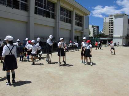 今回は、2年生が竹馬・フラフープ・ボール、4年生が遊具・竹馬・一輪車、6年生が鉄棒・フラフープ、遊具です。