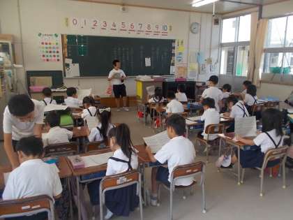 応援団のメンバーが、朝の時間に1年生の教室に行って応援歌の練習をしました。黒板にひらがなで歌詞を書いたり、プリントを指さしながら説明したりしていました。小学校で初めての運動会ですが、1年生も元気な声で応援してくれることと思います。