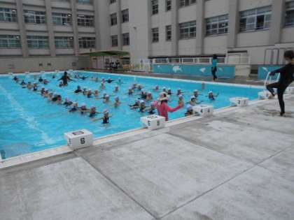 朝は曇りで心配しましたが、少しずつ晴れ間もでてきました。プールの水も少し冷たく感じましたが、元気に学習をしていました。1年ぶりの水泳学習なので、はじめはプールに入るときの注意やルールを確認しました。どの学年も少しずつ水慣れをしながら学習を始めていました。