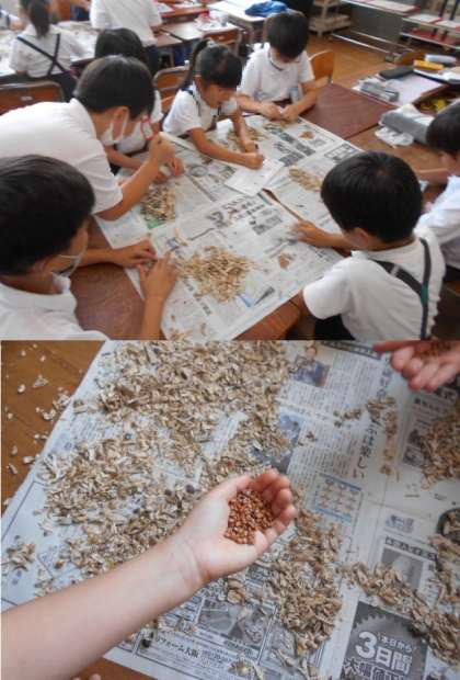 1学期最後の「ふれあいタイム」は、2学期に自分たちが植える田辺大根の種を莢から取り出す作業をしました。先日6年生が茶色に色づいた莢を畑から収穫しました。その莢から小さな種が飛び出してきます。1粒1粒ていねいに集めました。この小さな種が、いったいどんな田辺大根に育つのか楽しみですね。