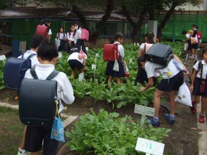 ふれあい農園でも、登校してすぐ虫取りや水やりをする子どもたちが多かったです。自分たちの大根は、自分たちで世話をするという気持ちがよくでていました。