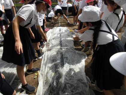 種を植えるとその上に不織布をかけました。これは、〇水をかけても種が流されない、〇鳥に種を取られない、〇保湿効果などの目的があります。最後にたっぷりと水をあげました。しばらくの間は、毎日の水やりがとても大切です。