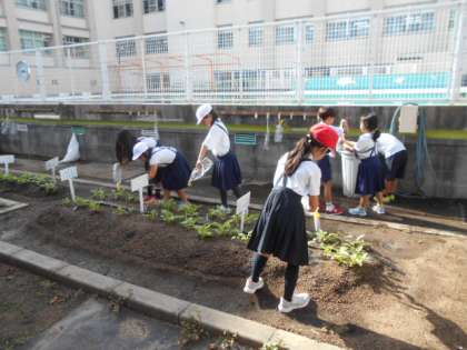 農園の「田辺大根」が順調に育ってします。今週も暑い日が続いているので、朝の水やりが大切です。今日は2年生が当番の日で、たくさんの人が朝から農園にきて水やりをしていました。