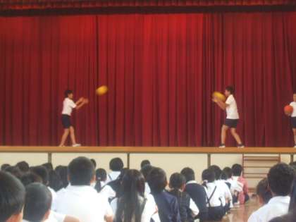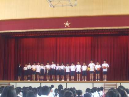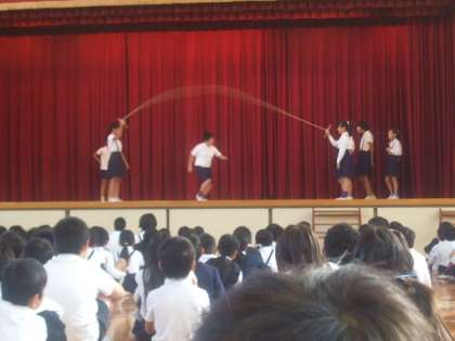 14日(水)の朝の児童集会は運動委員会の発表でした。本格的な「体育の秋」をむかえ、本校の体力づくりの取り組みである「ナガリンピックの種目の紹介をしてくれました。実際にボールや長縄を使って分かりやすく発表していました。